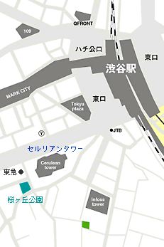 渋谷駅(JR/東急東横線/銀座線/半蔵門線)東口バスロータリーより、歩道橋を渡りセルリアンタワー(茶色の超高層ビル)を目指す。その裏手にあるポケットパークです。 |