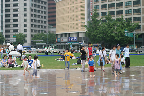 おなかもいっぱいになり、みんな満足して店を出る。市庁前広場では子供達が噴水で遊んでいてみんなびしょぬれ。というかこの噴水、道路と同じレベルなのに不意に吹き出すのでびっくり。